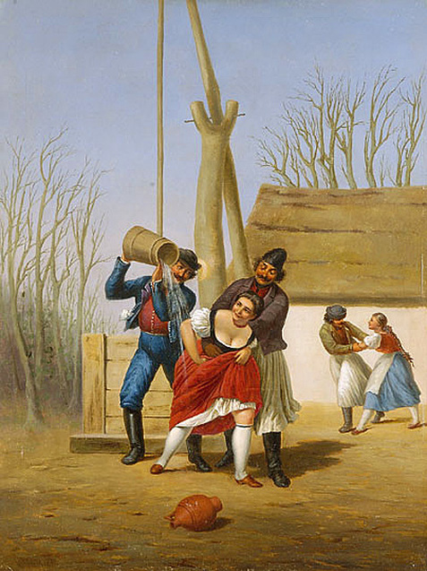 В козацькі часи, другий день Великодня був Днем Богородиці. Саме вона є берегинею роду і міцного шлюбу. Тому більшість традицій цього дня були пов’язані із залицяннями. З давніх-давен юнаки з відрами повними води ще вдосвіта ходили по хатах, де жили дівчата на виданні, та обливали їх. А ті натомість дарували хлопцям писанки на знак вдячності. Адже вважалося, що облита дівчина швидше вийде заміж за коханого хлопця. Зустрічалися звичаї, коли дівчина мала встигнути подарувати юнаку писанку, щоби той її не обливав, або ж дівчата ховали писанки за пазухою, а юнаки намагалися їх відібрати (але це вже більше схоже на залицяння, чи не так :) ). Такий звичай, наприклад, був широко розповсюджений на Гуцульщині: після символічної боротьби, отримавши нагороду (писанку), юнак вів дівчину до води і обливав. Вважалось, якщо дівчина повертається додому суха – це для неї ганьба. Тож дівчата хотіли, щоби їх облили, адже це свідчило про серйозні наміри парубка, котрий зазвичай обливав тільки ту, яка йому подобалась. Відповідно? на знак взаємності він отримував писанку або вишиту хустину. Щоправда це означало, що танцювати на великодніх святкуваннях він має тільки з нею. Колись на Закарпатті дівчат штовхали у річку, тому вони і близько не підходили до води. Але хлопці не здавались – хапали якусь і несли до потічка. А в одному із сіл цього району юнаки приходили до дівчини на виданні та кричали під вікном "Прийшли мити". Коли вона виходила, їй тричі лили воду на руки. Вона вмивалась і дарувала парубкам писанки.