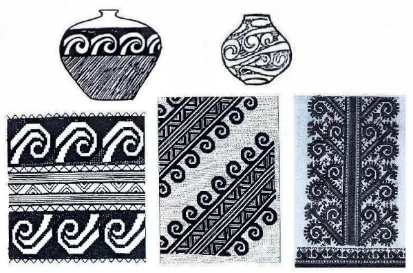Про характер узорів вишивки, їх розміщення свідчать зображення на знайдених археологами в Києві та Старій Рязані срібних браслетах, призначених для язичницького обряду русалій. На них відтворено гусляра й танцюриста в сорочках, вишитих геометричним орнаментом; русалку з довгими, оздобленими вишивкою рукавами; двох ткаль в одязі, прикрашеному вишивкою. В орнаментах улюбленими були різноманітні мотиви солярних знаків у вигляді чотири-, шести-, восьмипелюсткових розеток, які символізували небосхили, виражали ідею сонця. Адже побутування геометричного орнаменту доводить, що глибина народної пам’яті вимірюється тисячоліттями, і з плином часу символіка мотивів поступово втрачається, залишається тільки зовнішня форма, і орнамент стає прикрасою.