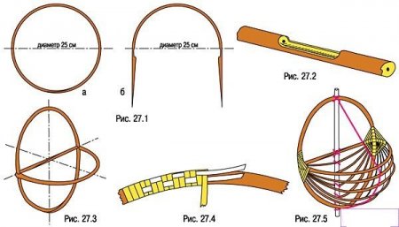 - Залишилося зробити облямівку. Прути для облямівки використовуємо дуже вологі. Беремо товсте шило. Встановлюємо його на крайку боки кошика у будь основини. Згинаємо основину через шило назовні і обводимо відразу дві праворуч стоять основини, кладемо всередину, там ще обводимо одну і виводимо назовні. Шило необхідно для того, щоб задати потрібну висоту загибке. Повторюємо те ж саме з іншими основинами. Четверту основину спариваем з першим кінцем, який стирчить назовні і парою обводимо дві зовні, одну зсередини і обидва кінця виводимо назовні. Вийшла перша пара для плетіння коси. Робимо всі інші пари для плетіння кіс. Має вийти три пари з шістьма основинами. З них треба плести коси. - Починаємо плести косу з отриманих пар акуратно, згинаючи прути. Плетемо, поки не дійдемо до першої пари, з якої почалася плести косу і де тепер стирчать клини. Прибираємо їх і вводимо в отвір кінці. Обрізаємо кінці. - Ручка. Ручка у такий кошика не вічна, іноді замість ручки пристосовують мотузку. Але цього краще не робити, так як інший матеріал може зруйнувати саму кошик.