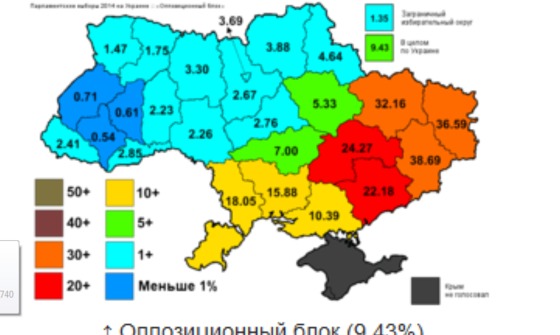 У 2014 році у 3-х східних руськоязичних областях (86,8%), за ПР проголосувало 35, 81% виборців, а в 3-х західних областях України, з найвищим відсотком україномовних громадян (94,4%), за ПР проголосувало лиш 0,62%, тобто в 56,6 разів менше.