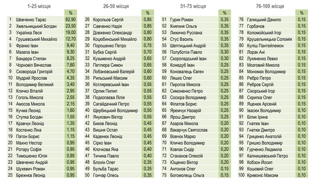 Роман Шухевич (1,0%) - український політичний і державний діяч, генерал-хорунжий, головнокомандувач Української повстанської армії, посмертно присвоєно звання Герой України.
