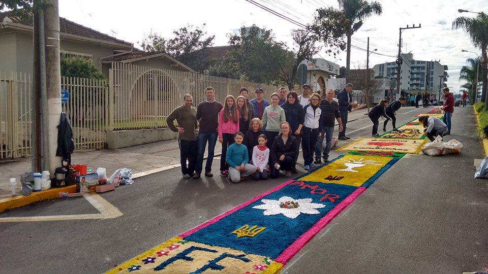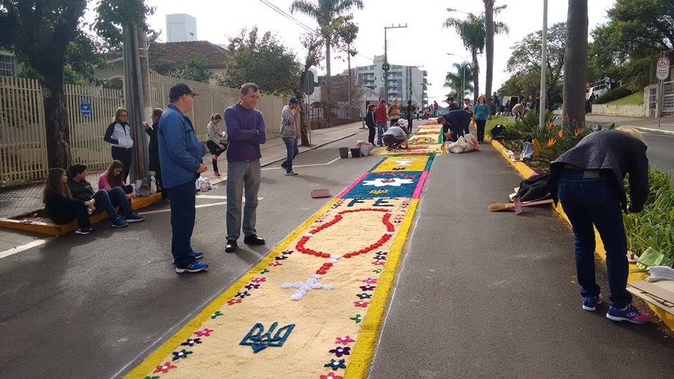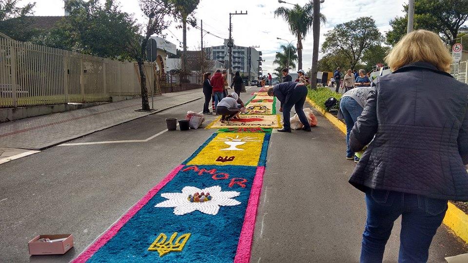 Нещодавно католики Бразилії відзначали Свято Тіла і Крові Христових. Відтак українська громада міста, прикрашаючи традиційними килимами з тирси вулиці, не забула і про Україну.