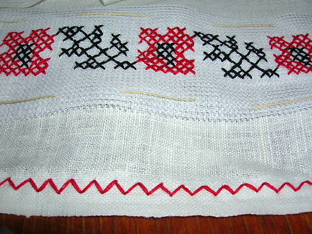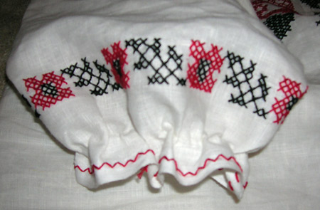 5. Оздоблення нижніх частин сорочки. Нижні частини основної частини та рукавів сорочки доцільно обробити тоненькою мережкою - дуже простим і гарним варіантом є оздоблення зигзагоподібною лінією (як на малюнку). До речі, зверніть увагу при покупці тканини: часто край полотна спресований і на ньому пробиті дірочки, по яких дуже легко вишити саме такий візерунок! Дуже зручно виходить - і край тканини підшивати не треба, і дірочки ховаються під візерунком, і сам візерунок гарно прикрашає низ рукава і самої сорочки :)