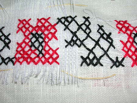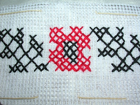3. Канва. Щоб вишиті хрестики були рівними, необхідна канва - спеціальна сіточка, яка нашивається на тканину. Виходить таке собі подвійне полотно. Вишиваємо, втрапляючи голкою у дірочки на канві. Після закінчення візерунку канва по ниточці висмикується - залишаються лише рівні хрестики на полотні: