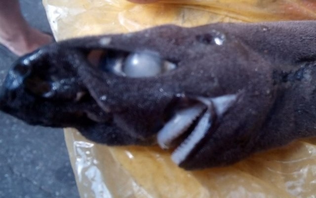 Голова спійманої у Чернігові риби нагадує голову чорної акули. Втім, у акули зовсім інша будова тіла. А деснянська істота більше схожа на вугра.