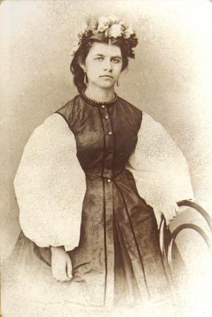 Зокрема, на фотографіях матері Лесі Українки – Ольги Петрівни Косач (в дівоцтві Драгоманової) можемо побачити поєднання українського вбрання із компонентами європейського одягу. Українська частина її убрання представлена найбільш знаковими та давніми речами – головним убором, вишитою сорочкою, намистом, керсеткою, конструкція і оздоба якої має порівняно недавнє оформлення. Поясна частина являє собою модну на той час спідницю – кринолін. Водночас пишна зачіска з укладеним в локони волоссям, модні світські прикраси, спосіб фіксації віночка, зав’язування хустки й намітки, а також аристократична постава видають високий аристократичний статус.