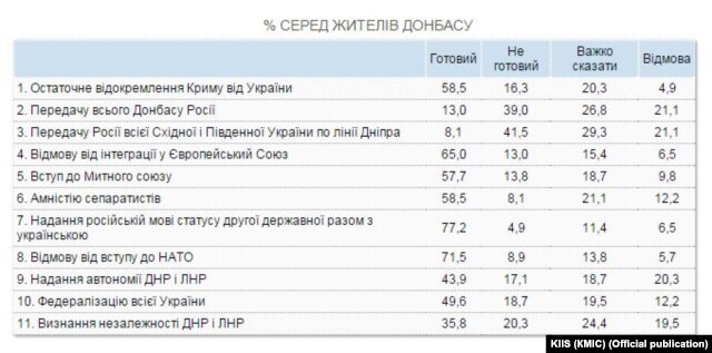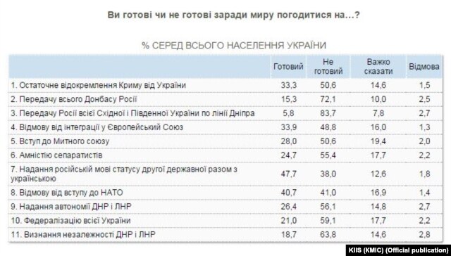 Майже половина українців (47,7%) віком від 18 років заради миру готові надати російській мові статус другої державної, трохи менше (40,7%) – відмовитися від вступу до НАТО, а третина (33,9%) – відмовитися від вступу в Європейський союз. Що ж стосується Криму та Донбасу, то остаточно віддати Крим Росії вважають за правильне 33% опитаних, а визнати незалежність угруповань «ДНР» і «ЛНР» – майже 19%.