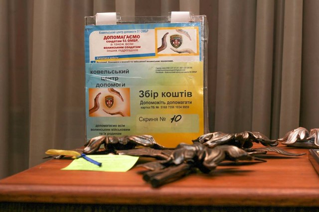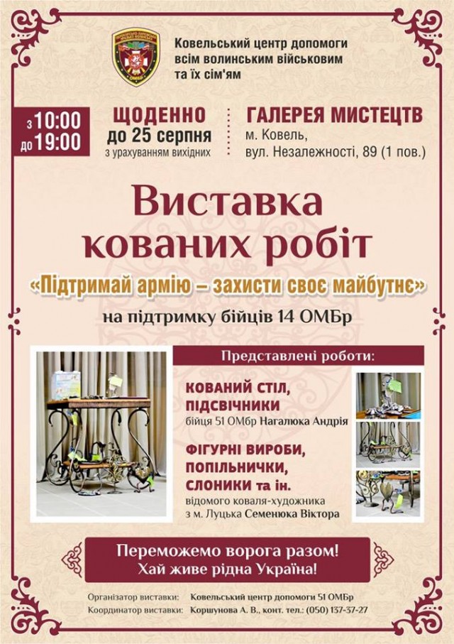 Мешканців Ковеля та гостей міста запрошують на виставку-продаж кованих робіт відомого майстра з міста Луцька та бійця 51 ОМБр Андрія Нагалюка, долю якого не оминув страшний полон. Виставку організовує Ковельський центр допомоги 51 ОМБР, про що повідомляє у Фейсбуці. Згідно з повідомленням, зараз Андрій займається своєю улюбленою справою, ковкою по металу і радо відгукнувся на пропозиціюта підтримати своїх побратимів на сході. «Всі вилучені кошти підуть на підтримку бійців 14 ОМБр. Не будьте байдужими, підтримайте тих, хто боронить наш МИР», - йдеться у повідомленні. До слова, як повідомляло Інформаційне агентство Волинські Новини, аби допомогти українським бійцям, волинський коваль Віктор Семенюк вирішив продати свої унікальні скульптури, які майстрував десять років.  Ковані скульптури Віктора Семенюка на аукціоні викупив засновник Фонду «Новий Луцьк» Ігор Палиця. За виручені гроші, згідно з ідеєю майстра, і додаткові 100 тисяч гривень від Фонду були придбані позашляховики для АТО.