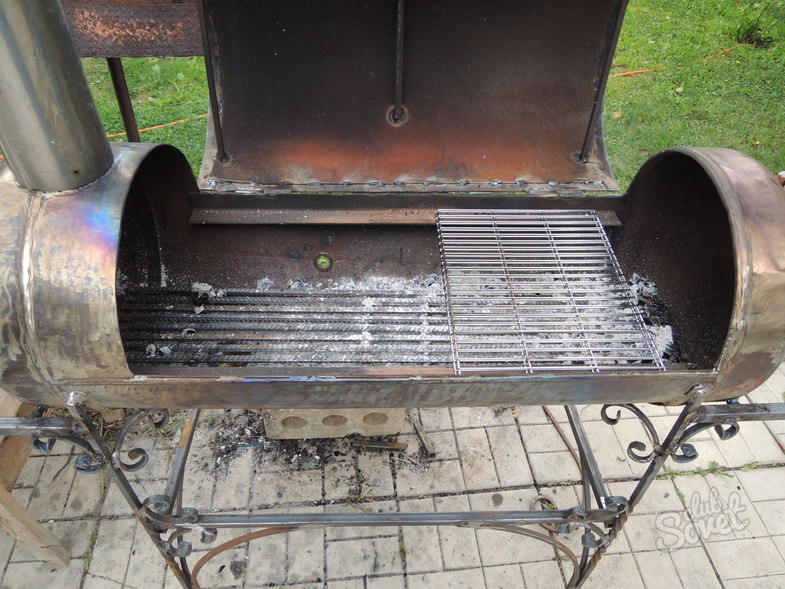 У нижній частині мангала, в районі горіння майбутнього вугілля, свердлом по металу необхідно зробити штук 20 отворів, діаметром в 10-20 мм. Вони потрібні для створення тяги, щоб дрова добре горіли. Якщо є бажання і можливість, то на торці мангала можна зробити витяжну трубу. Для цього за допомогою зварювального апарату вирізається отвір, діаметром 10-15 см, а потім у нього ж вварюють трубу такого ж діаметру.