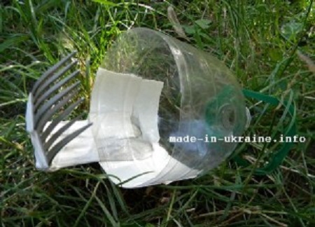 Все, садовий зйомник своїми руками готовий! Залежно від розміру ягід чи фруктів ви можете регулювати його: фіксувати виделки нижче до пляшки (у випадку вишень і черешень) або вище (для більших плодів). Гарного вам врожаю!