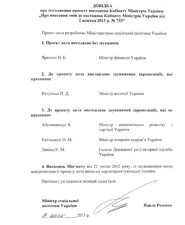 Свої висновки щодо незаконності такої процедури давали декілька державних установ, найбільш прямими були висновки Державної регуляторної служби (ДРС). Спочатку голова служби Ляпіна К. М. ще 26 лютого 2015р. написала міністру соціальної політики Розенко П. В. наступне: