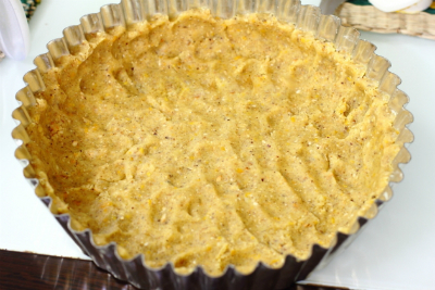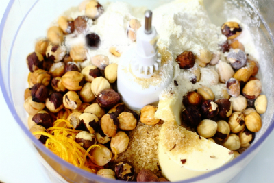 3) Збити в кухонному комбайні борошно, горіхи, цукор, вершкове масло, яєчний жовток і 2 столові ложки апельсинової цедри.