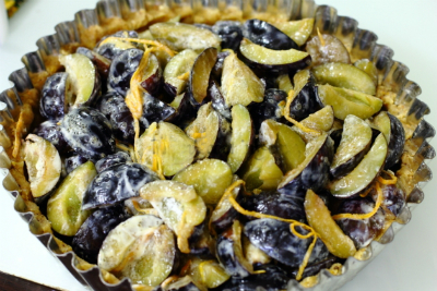 1 кг стиглої сливи2 ст.л. густої сметани2 ст.л. коричневого цукру1 ст.л. апельсинової цедри1 ст.л. крохмалю