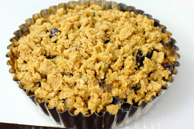 6) Випікати пиріг від 40 до 50 хвилин, верхня крихта повинна зарум'янитися і сливи повинні добре пропектися. Вийняти з духовки і дати охолонути близько 10-15 хвилин.