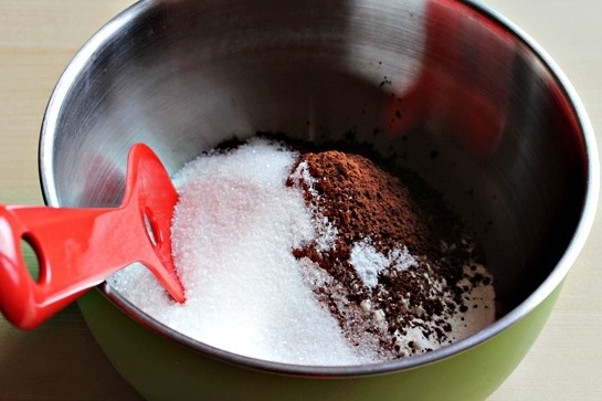 Процес приготування. У глибокій мисці змішати цукор, сіль, какао, борошно з розпушувачем.