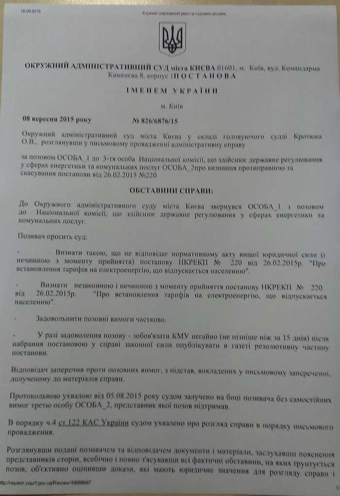 У травні громадські організації, об’єднані в спільну ініціативу “Ціна Життя”, оскаржили в Адмінсуді Києва постанови Національної комісії, що здійснює державне регулювання у сферах енергетики та комунальних послуг (НКРЕКП), про підвищення тарифів на газ, електроенергію, опалення. 8 вересня суд визнав постанову НКРЕКП від 26 лютого 2015 року № 220 “Про встановлення тарифів на електроенергію, що відпускається населенню” незаконною і нечинною з моменту прийняття.