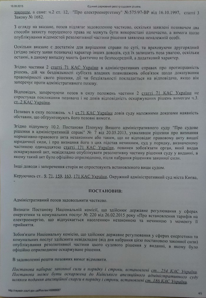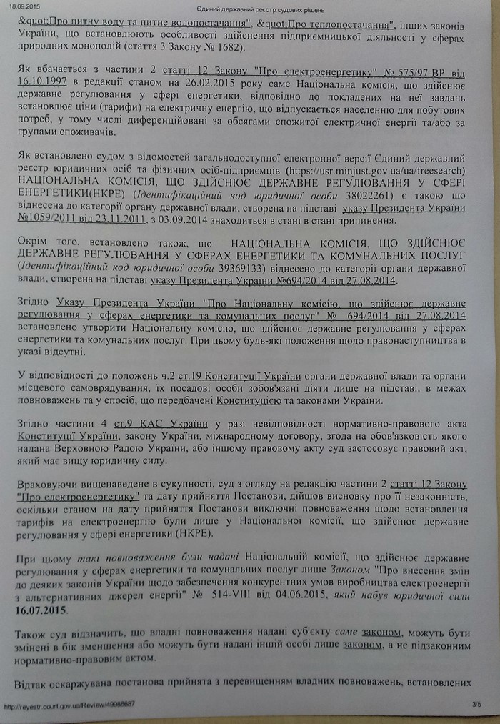 Суд визнав Постанову НКРЕКП незаконною, бо згідно чинної на момент її прийняття редакції частини 2 статті 12-ї Закону “Про електроенергетику” виключні повноваження встановлювати тарифи на електроенергію мала тільки попередниця НКРЕКП – Національна комісія, що здійснює державне регулювання у сфері енергетики (НКРЕ). А такі повноваження були надані НКРЕКП тільки законом від 4 червня 2015 року, який набув чинності 16 липня 2015 року. Тобто НКРЕКП в лютому не мала повноважень підвищувати ціни на світло.