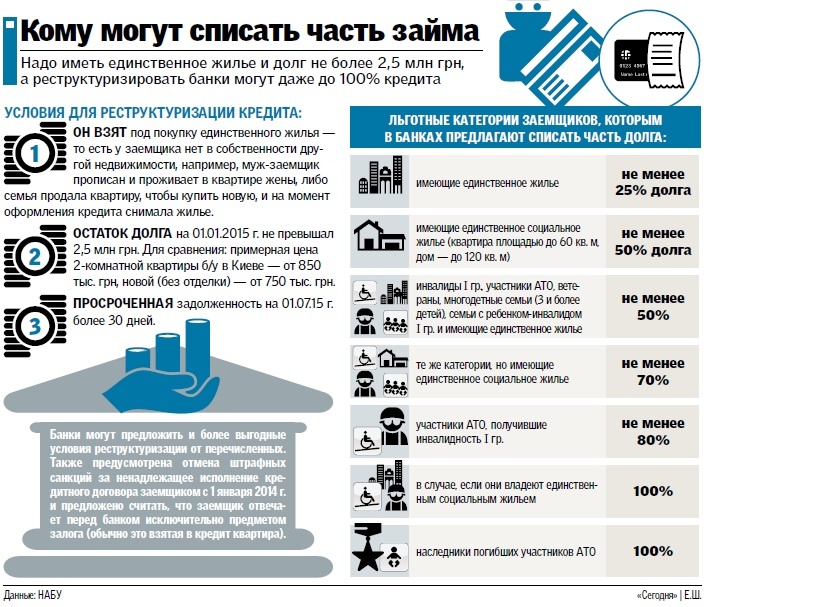 Тепер, за інформацією прес-служби Нацбанку, Фонд змінив свою позицію і погодила новий законопроект, запропонований Незалежною асоціацією банків України (НАБУ). У НАБУ розповіли, що їхній проект – соціально спрямований: небагаті люди, що взяли кредит під недороге житло (вартістю до 2,5 млн грн у нинішніх цінах), зможуть за нього розрахуватися, тому що їм спишуть 25-100% боргу. Кому саме і на яких умовах спишуть валютні позики – див. інфографіку. Банкам збитки компенсуватися не будуть.