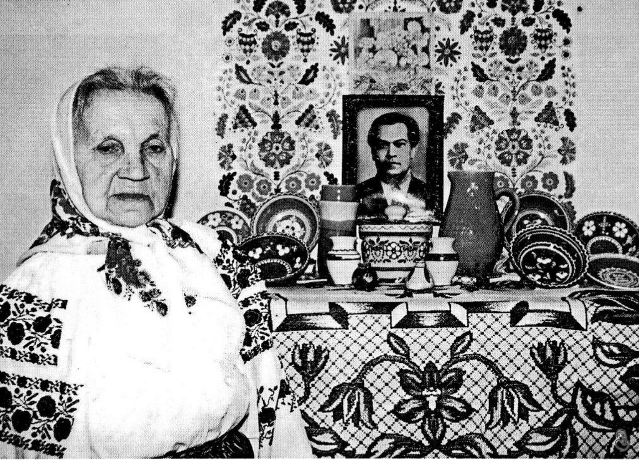 Мотрона Назарчук біля своїх творів та фотографії сина. Запоріжжя. 1990-ті роки.Автор фото невідомий. Національний музей-заповідник українського гончарства в Опішному, Національний архів українського гончарства