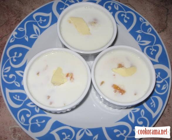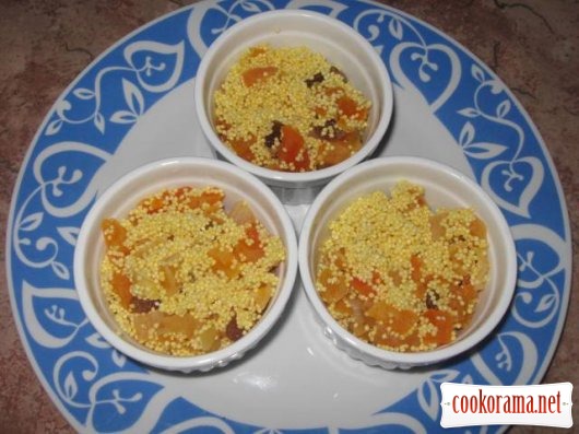 Пшоно промити декілька раз, щоб не було білого нальоту, потім залити гарячою кипяченою водою. Кипятком теж залити іродзинки та курагу. З пшона зливаємо воду, курагу дрібно нарізаємо. Все перемішуємо з пшоном. Викладаємо масу у формочки.Заливаємо молоком. Ріжемо шматочками вершкове масло і кладемо зверху на молоко. Духовку розігріваємо до 190С і ставимо у духовку на 1,5 годину ( у мене за 1 годину було готове). В процесі можна доливати молоко. Якщо зверху почне пригорати, то зменшити температуру до 180С.