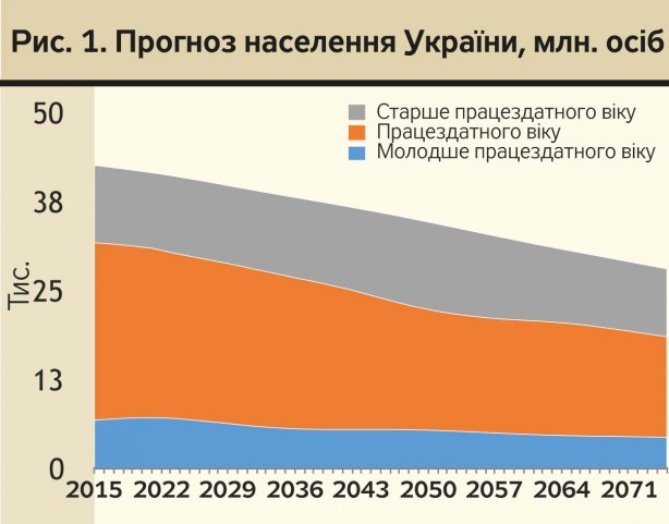 За модельними розрахунками, в основу яких покладено середній варіант прогнозу Інституту демографії та соціальних досліджень, до 2075 р. населення України скоротиться до 28,2 млн, тобто більш як на третину (рис. 1). Найбільшого скорочення зазнає чисельність населення працездатного віку (з майже 25 млн до 14 млн осіб, або на 43%). Кількість людей старше працездатного віку до 2021 р. дещо скорочуватиметься, а коли закінчиться підвищення пенсійного віку для жінок, — почне зростати (з