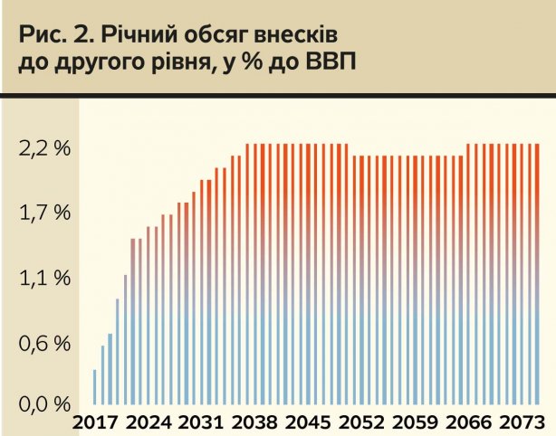 Обсяг внесків до другого рівня у стартовому 2017 р. становитиме майже 7 млрд грн (у поточних цінах), або 0,3% ВВП. У 2022 р., коли розмір внеску досягне 7%, а кількість платників — майже 8 млн осіб, обсяг внесків сягатиме понад 52 млрд грн (у поточних цінах), або 1,4% ВВП. Після того, як усі застраховані особи стануть учасниками дворівневої системи, річна сума внесків стабілізується на рівні 2–2,2% ВВП (рис. 2). На відповідні суми зменшуються надходження внесків до солідарної системи.