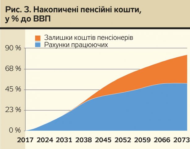 За умови забезпечення прогнозованого рівня реальної "чистої" інвестиційної доходності пенсійних активів (+2% понад покриття інфляції та витрат на адміністрування) у другій половині 2040-х років сумарний обсяг накопичених пенсійних коштів перевищить 50% ВВП, а наприкінці прогнозованого періоду сягатиме 83% ВВП (рис. 3). Це кошти, які справді можна буде інвестувати в розвиток країни. Але існує кілька обставин, на які треба звернути увагу.