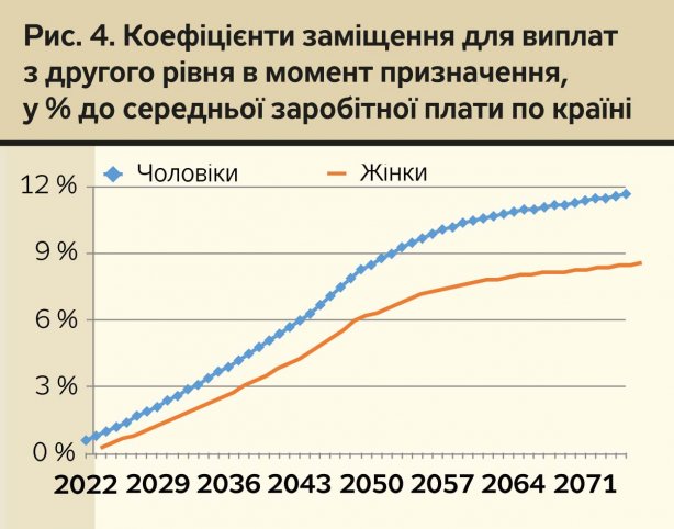 За передбачених стартових умов пенсійні виплати з другого рівня почнуться з 2022 р., але у перших пенсіонерів з дворівневої системи їхній розмір становитиме менш як 1% середньої заробітної плати по країні (рис. 4). Досягти коефіцієнта заміщення на рівні розміру внеску (7%) удасться чоловікам у 2046 р., жінкам — у 2055 р. Наприкінці прогнозованого періоду коефіцієнт заміщення пенсій з другого рівня у нових пенсіонерів становитиме близько 8% у жінок і трохи менше 12% — у чоловіків (за умови реальної "чистої" інвестиційної доходності пенсійних активів на рівні 2%). Отже, беззаперечна економічна доцільність участі у другому рівні існує тільки для людей, які долучилися до нього від самого початку трудової діяльності.