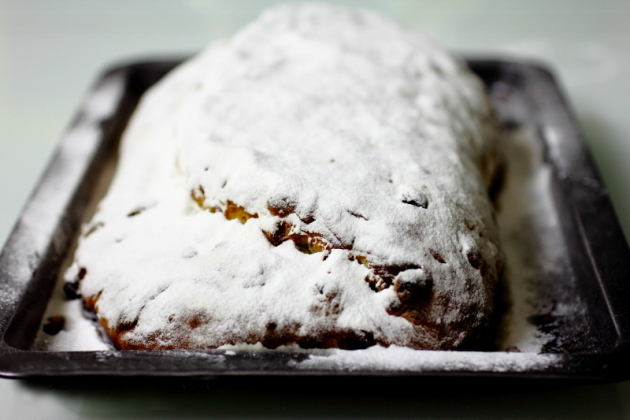 7) Вийняти випічку з духовки, дати хвилин 5 охолонути, а потім швидко втерти вершкове масло в поверхню штоллена. Відразу ж рясно посипати цукровою пудрою. Від тепла цукрова пудра почне трохи розтоплюватися, ви ж посипайте, поки поверхня не стане сніжно-білою.