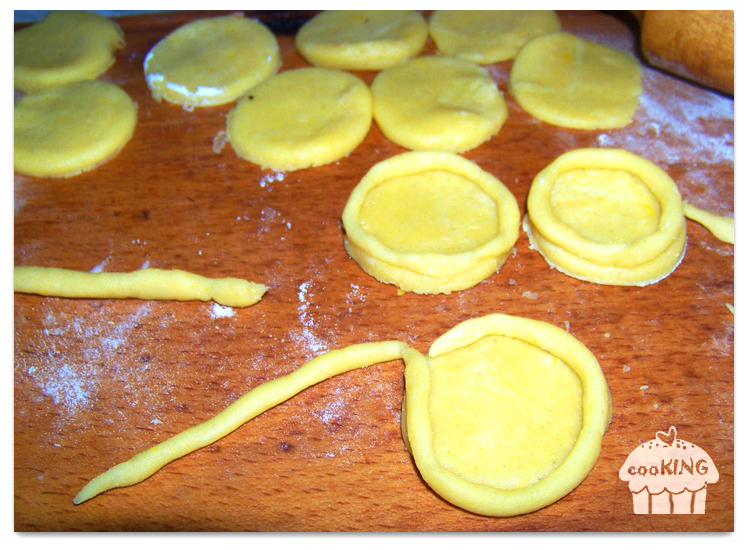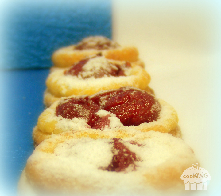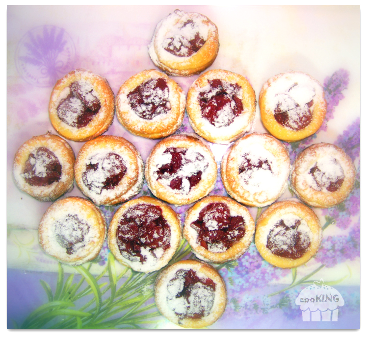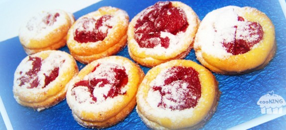 Тісто розкачати на посипаній борошном дош¬ці і склянкою вирізати коржики. Змастити їх білком, краї обкласти валиком з тіста, а зверху покласти вишні.