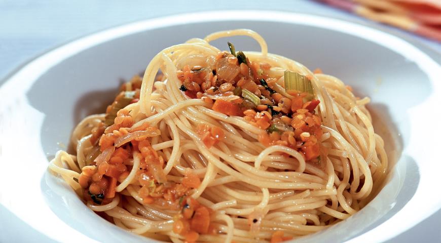 Рецепт. Овочі та зелень вимити, очистити і дрібно нарізати. Цибулю, часник, селеру і моркву обсмажити в розігрітій олії на повільному вогні, 4-5 хвилин. Додати сочевицю, помідори, спеції і 400 мл води, довести до кипіння і тушкувати 20 хвилин. За 5 хвилин до готовності посолити і посипати зеленню. Бекон нарізати тонкими смужками і обсмажити на сухій сковороді, 5 хвилин. Відварити спагетті. Посипати беконом і подати з соусом.