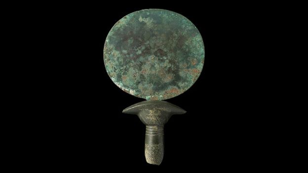 Це люстерко з мідного сплаву походить з ІІ тисячоліття до нашої ери; його ручка зроблена з каменю і виточена у формі стебла папірусу