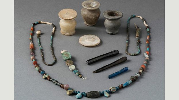 Є також банки і склянки з світлого кальциту, в яких, ймовірно, зберігалися косметичні засоби, мазі та парфуми. Нарешті, є пасмо людського волосся, яке дозволяє припустити, що давні єгиптяни користувалися шиньйонами і перуками.