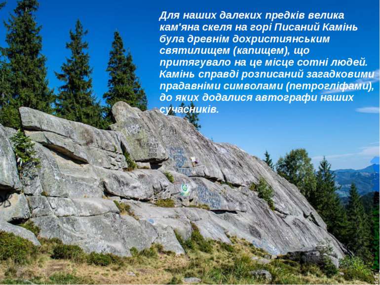 Неподалік від Буковецького перевалу у Верховинському районі височить Писаний камінь. Це утворена з піщанику скеля висотою 20 метрів. www.newskraine.com.ua