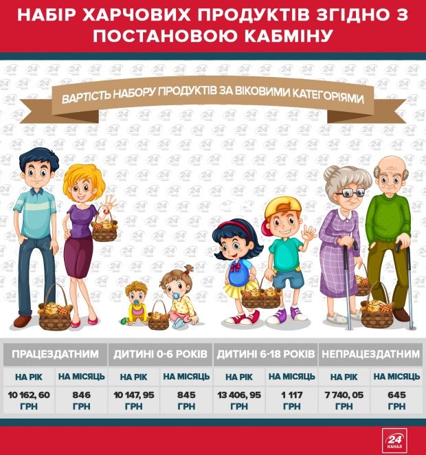 Ми порахували приблизну вартість того списку продуктів, який мінімально має споживати кожна категорія громадян. У постанові закріплені категорії – діти від 0 до 6 років, діти 6-18 років, працездатне населення (повнолітні допенсійного віку) і непрацездатне (пенсіонери і ті, хто за станом здоров'я не можуть працювати). Ціни на продукти брали з інтернет-магазинів – найменші, які можна знайти. У звичайних магазинах ціни дещо вищі. Крім того, найдешевші продукти часто не найкращої якості.