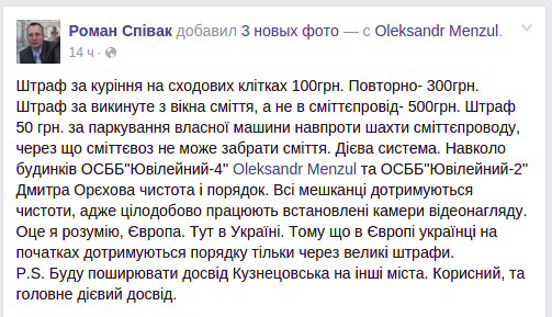 Про це повідомив голова правління Всеукраїнської асоціації з питань енергозбереження Роман Співак на свої сторінці Facebook. «Штраф за куріння на сходових клітках — 100грн. Повторно — 300грн. Штраф за викинуте з вікна, а не в сміттєпровід, сміття — 500грн. Штраф 50 грн за паркування власної машини навпроти шахти сміттєпроводу, через що сміттєвоз не може забрати сміття. Дієва система. Навколо будинків ОСББ «Ювілейний-4» Oleksandr Menzul та ОСББ «Ювілейний-2» Дмитра Орєхова чистота і порядок», - написав він.