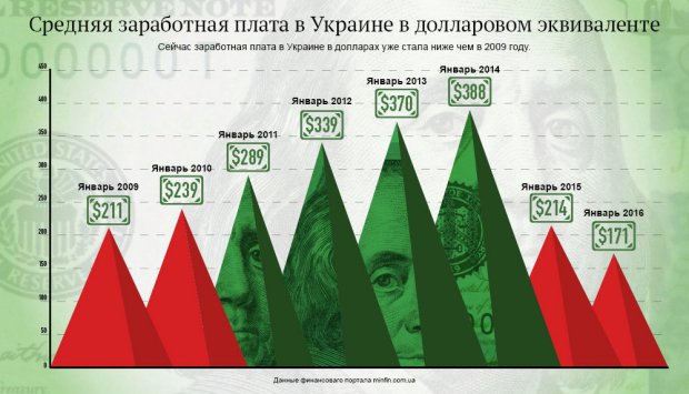 У січні 2016 року середня зарплата в Україні стала на 40 доларів меншою, ніж в аналогічний період 2009 року — найважчий період попередньої економічної кризи.