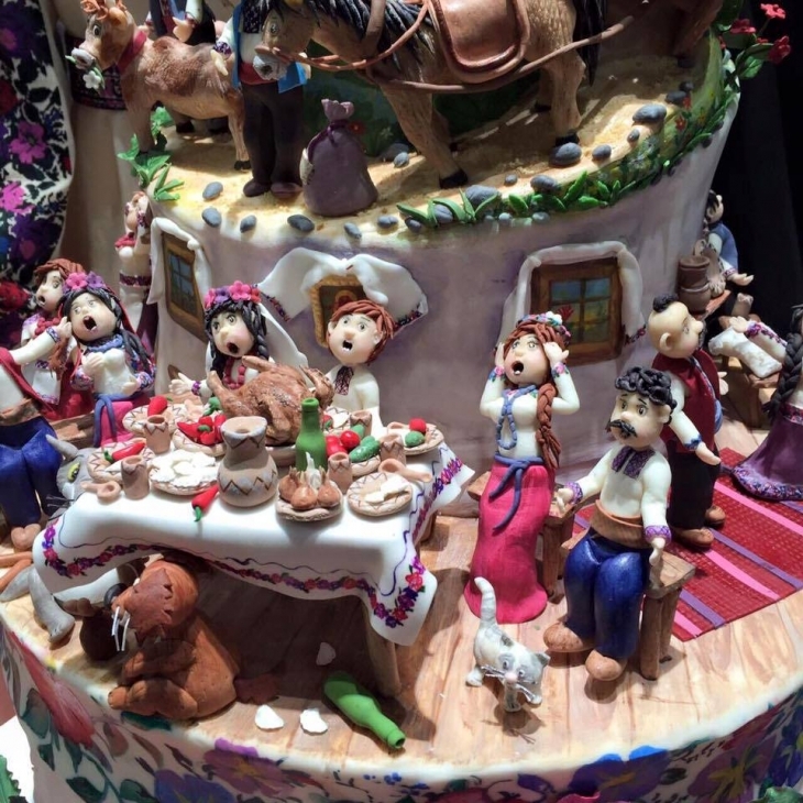 — Щороку до Варшави з'їжджаються європейські кондитери. Україна цього року була вперше там представлена. 16 конкурсантів приїхали з різних країн. — розповідає Роксолана. — На торті я зобразила українське село, гори. Всі фігурки — у вишиванках із різним орнаментом. На столі — вареники, часник, цибуля, печена курка.