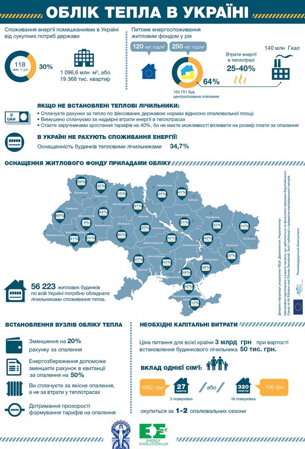 В Україні потрібно встановити 65 тис будинкових лічильників тепла, вартість одного — 50 тис грн. У п'ятиповерховому будинку внесок на колективний лічильник з однієї квартири становить 1 тис грн, у 16-поверхівці — лише 160 грн.