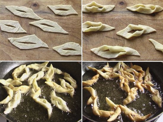 Добре розкачайте тісто дуже тонким шаром. Потім наріжте тісто невеликими прямокутниками (шириною 2-3 см, довжиною 10-15 см), в середині кожного зробіть поздовжній розріз і через нього пртягніть, вивернувши, одну зі сторін прямокутника. Залиште заготовки постояти протягом п'яти хвилин.