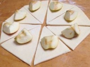 Потім – кожну частинку розкачати в коло товщиною приблизно 5 мм, по діагоналі розрізати на 8 частин (приблизно у формі трикуткиків).