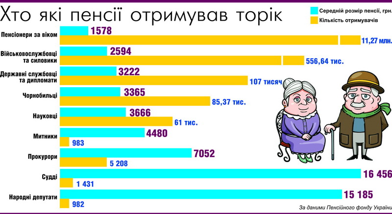 Торік ПФ витратив на виплату пенсій приблизно 265 мільярдів гривень, з яких лише 170 мільярдів — власні кошти. Майже 95 мільярдів довелось дофінансовувати з бюджету, тобто знову ж таки з коштів платників податків. За словами голови Пенсійного фонду Олексія Зарудного, цього року витрати на пенсійне забезпечення зростуть на 7,5%, або 18,5 мільярда гривень.