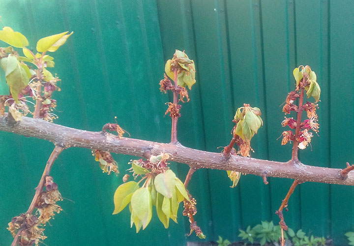 Швидкість всихання і характер пошкодження дерев абрикоса в цьому році нагадує дію морозу. Однак на початку вегетації і особливо в період цвітіння абрикоса мінусові температури в республіці не спостерігалися. І тим не менше дерева абрикоса стоять з всохлим листям і зав’язями. Все це витівки моніліозу. Слід очікувати, що в літній час уражені ним в різному ступені дерева загинуть і плоди що залишилися, покриються суцільним або у вигляді подушок густим сірим нальотом. На основних гілках, уражених моніліозом, зараз відзначається виділення камеді, що, можливо, приведе надалі до розтріскування кори і загибелі гілок.