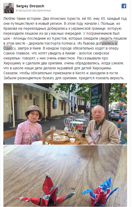 Не дивлячись на поважний вік, японські туристи щороку мандрують світом. Цього разу подружжя вирішило після Польщі відвідати Україну та подивитися на Київ, Одесу та Львів, повідомив блогер Сергій Дрожач.
