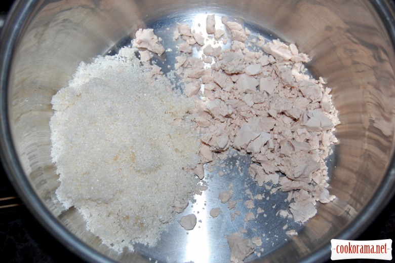 Спочатку треба приготувати опару: розтерти свіжі дріжджі з половиною шклянки цукру: