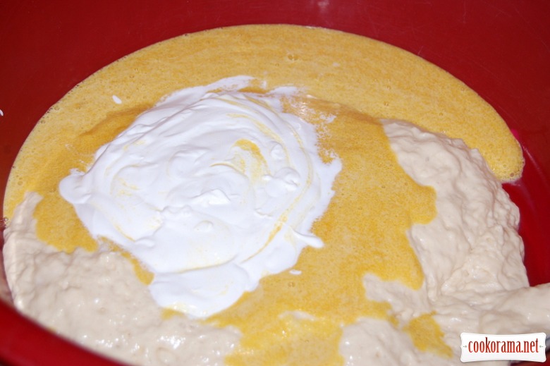 Відділити білки від жовтків. Жовтки розтерти з цукром і додати в опару. Сметану кімнатної температури теж вмішати в опару: