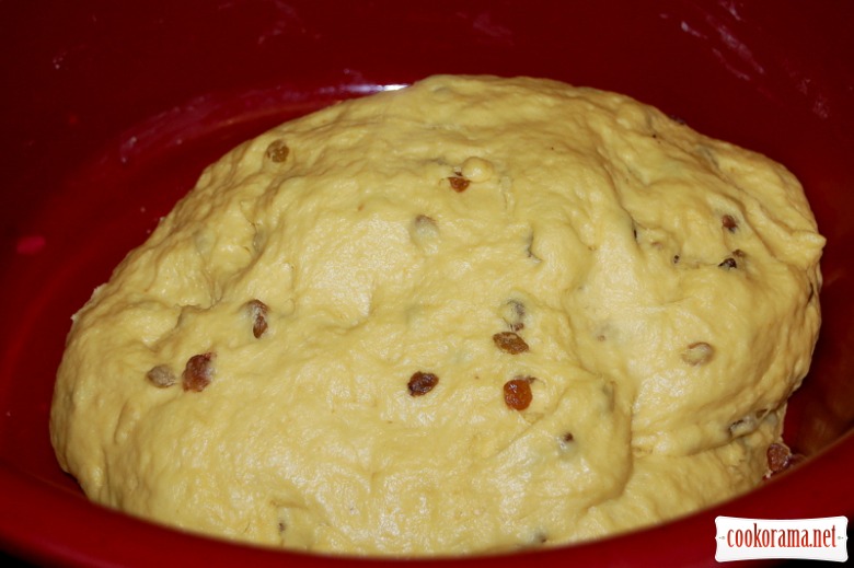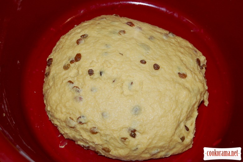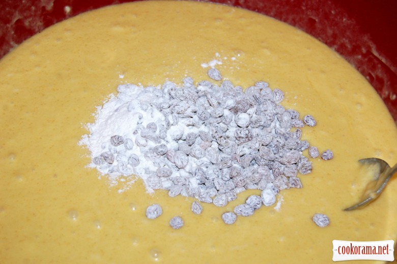 Родзинки перебрати, промити, обсушити і обваляти в борошні. Додати підготовлені родзинки в тісто:
