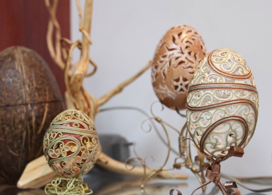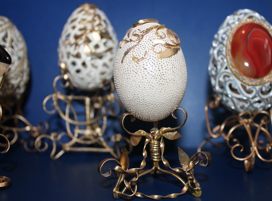 І я під враженням не можу відвести очей. У колекції є різьблене й інкрустоване яйце ему, світильники зі страусиних яєць, шкатулки з гусячих, курячі «яйця із секретом», які піднімаються та опускаються, ховаючи всередині обручки, надзвичайно ніжні перепелині експонати. На окремій поличці – портрети відомих людей, виконані у техніці «дряпанка». А які гарні яйця, викладені з бурштинової крихти і відполіровані! Здається, що вони витесані із суцільного каменя, а насправді всередині порожня яєчна шкаралупа.