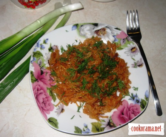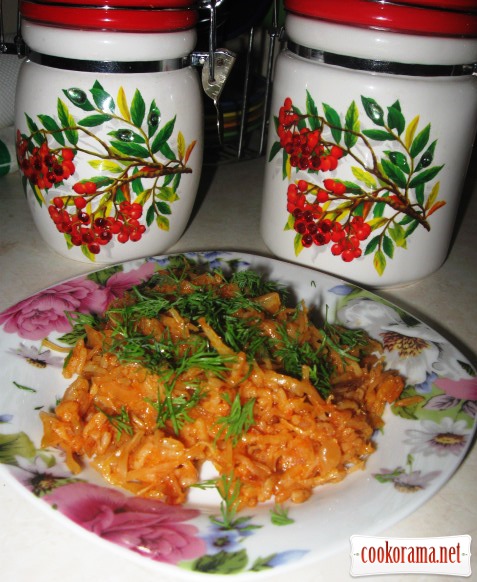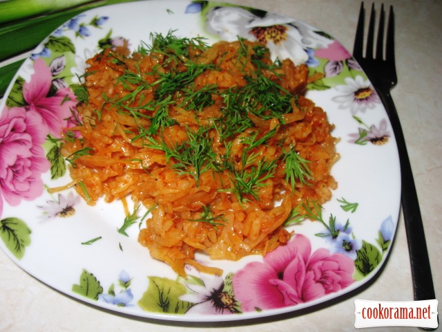 Розігріти в глибокій сковородці олію. Цибулю нарізати півкільцями, капусту тонко нашаткувати. Покласти в сковорідку цибулю, трохи обсмажити. Додати до цибулі капусту і смажити помішуючи, поки капуста не стане світло коричневого кольору. Додати лавровий лист і спеції. ( кмин, коріандр, паприку, грецькі трави). Додати промитий рис, томатний сік і приблизно 150-200 мл. кипятку. Посолити, довести до кипіння. Зменшити вогонь до мінімуму, накрити кришкою і тушкувати хвилин 25, до готовності рису. Перед подачею посипати зеленню.