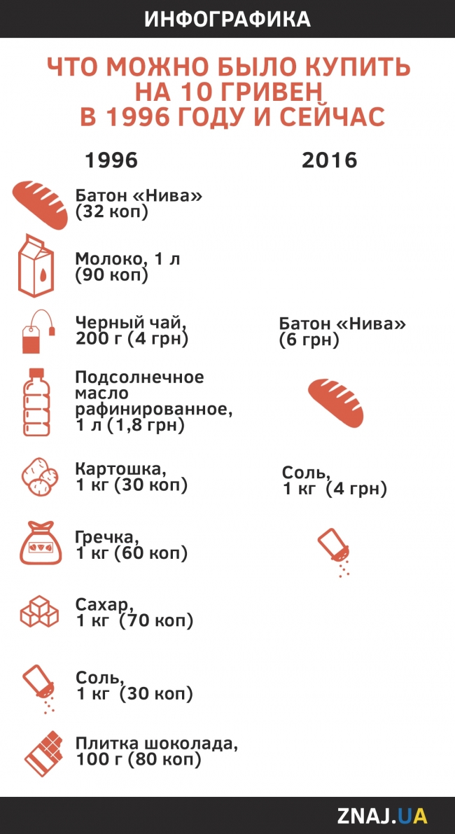 “На 10 гривень можна було так скупитися, як це неможливо зараз на 200. Наприклад, 1997 року чоловічу футболку можна було купити за цю суму. Зараз така коштує 300 гривень. До 1998 року на “десятку” можна було заправити 17 літрів бензину. Зараз така заправка обійдеться у 390 гривень”, – каже фахівець.